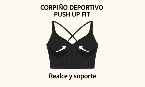 El Corpiño Deportivo Push Up Fit combina soporte, estilo y comodidad en una sola prenda. Diseñado para realzar el busto de forma natural y mantener una sujeción firme sin perder libertad de movimiento, es ideal tanto para entrenar como para usar todos los días.
